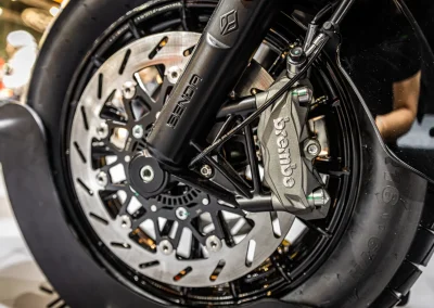 Systemy bezpieczeństwa: radialne, czterotłoczkowe zaciski Brembo z przodu wgryzające się w dwie duże tarcze hamulcowe oraz jednotłoczkowy zacisk Brembo z tyłu, wspierane przez dwukanałowy, wyłączany ABS oraz kontrolę trakcji (TCS). Pompa hamulcowa to również dzieło włoskiego Brembo.